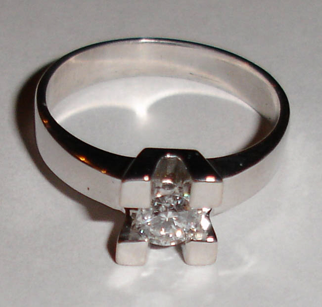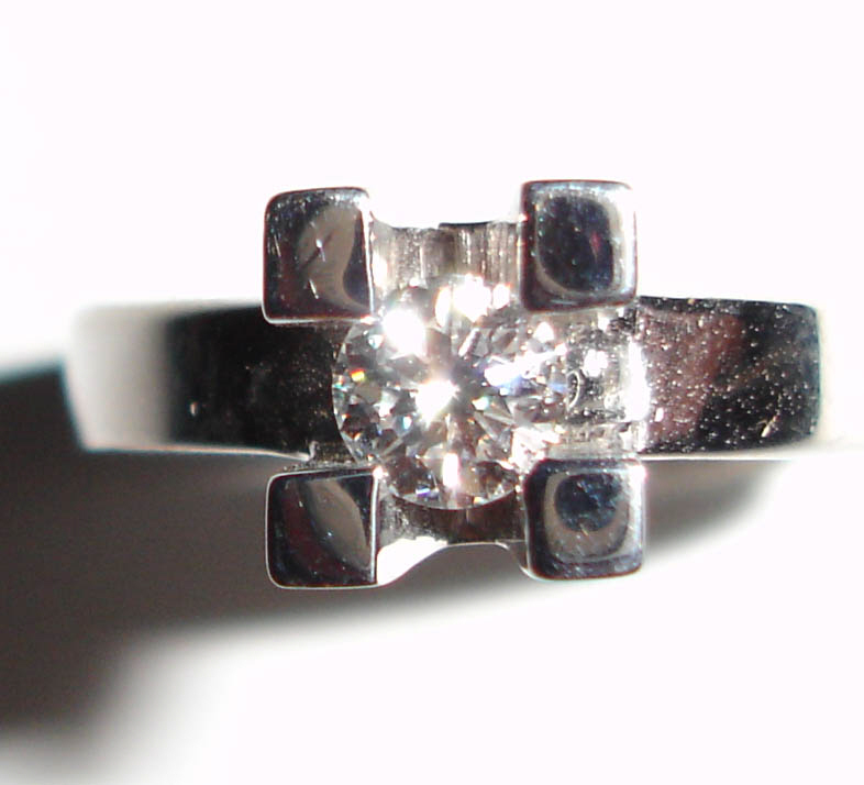 Anillo en oro blanco con una garra muy robusta con 1 diamante talla brillante blanco engastado a mano con mucha luminosidad y un peso de 0.50 quilates.